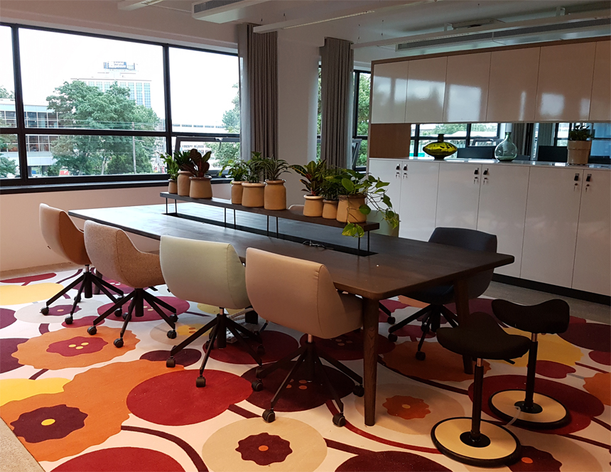 Lunch table with solid wood top equipped with two pieces of LED fixtures and plant hangers. The frame is fixed to the ceiling.