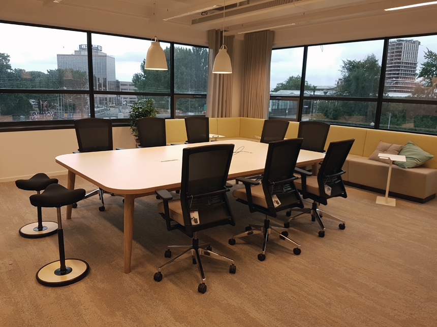 Furniture for an office environment with integrated cable ducts and connection points for data and power supply.