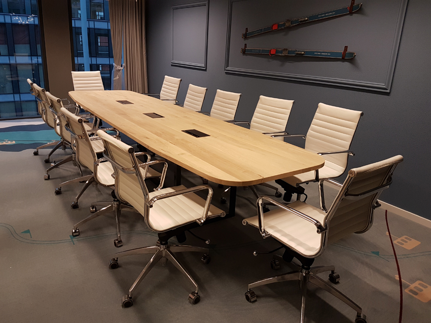 Oversized tables for consultation and work situations made of solid oak wood. The table bases are made of steel and wood.