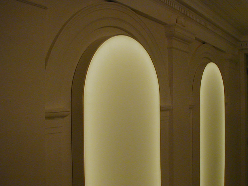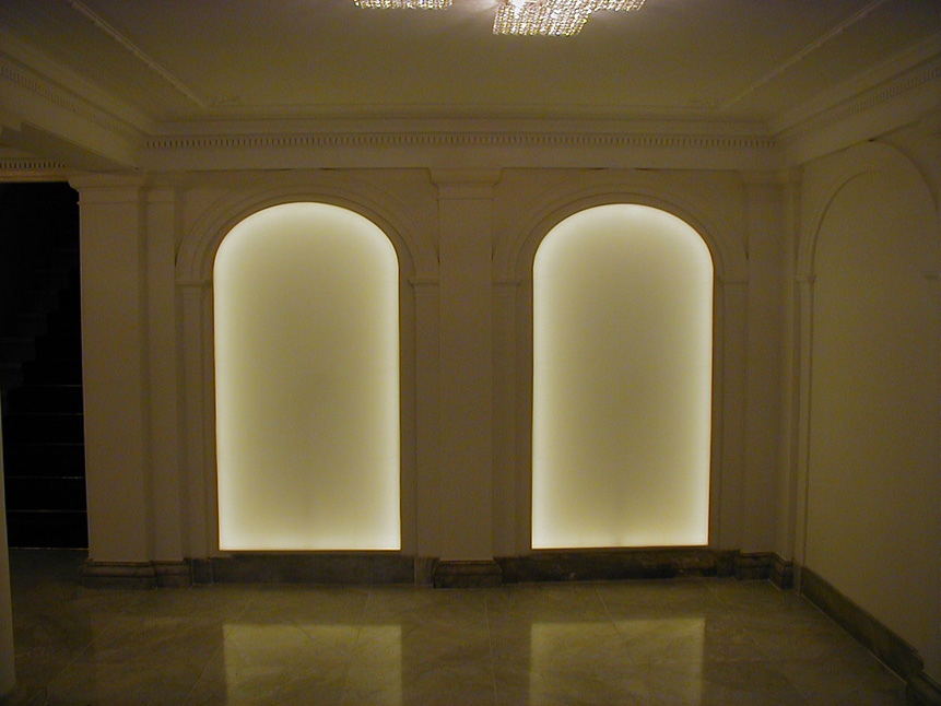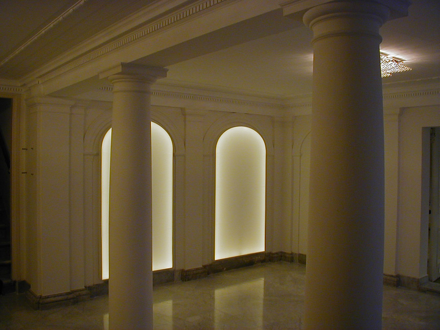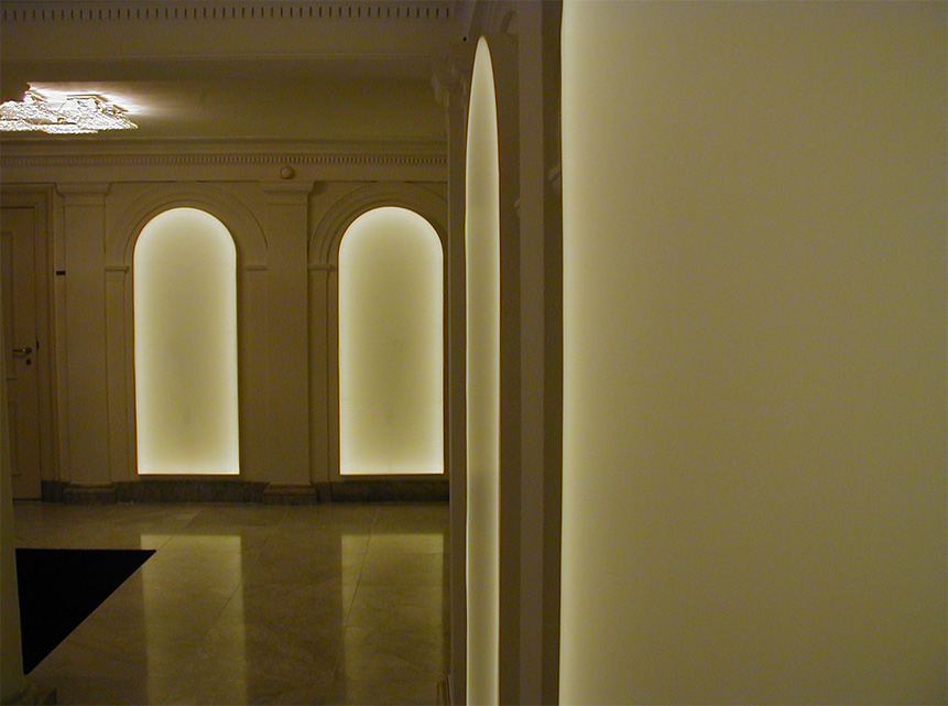 Large illuminated panels, that follow the curved shape of the wall relief, to illuminate the entrance hall extra without affecting the architectural environment.