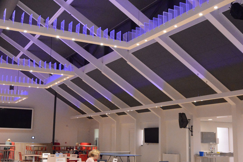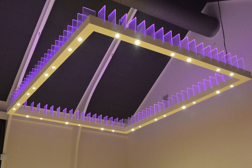 The uplight consists of RGB LED lines with acrylic panels. The diffuse effect of the panels spread the RGB light effect. Through this spread the entire space can be filled with a specific light atmosphere.