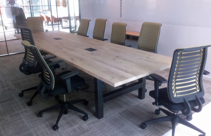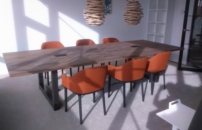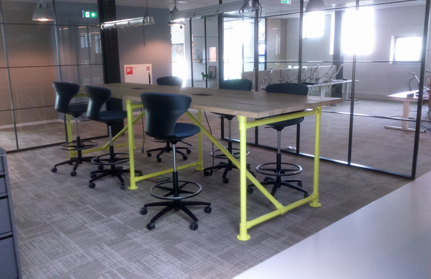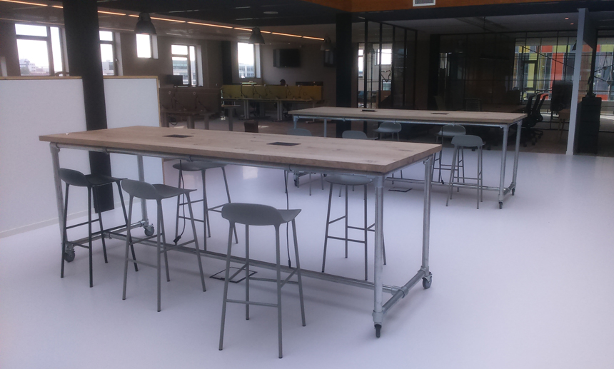 The table tops, as a work or meeting place, are equipped with cable cubbies and made out of solid oak wood. The table bases are made of steel tubes or based on powder-coated scaffolding tubes.