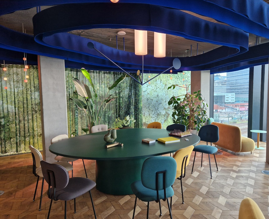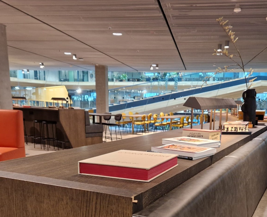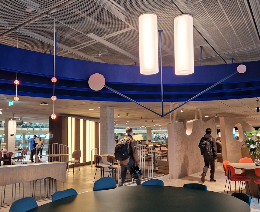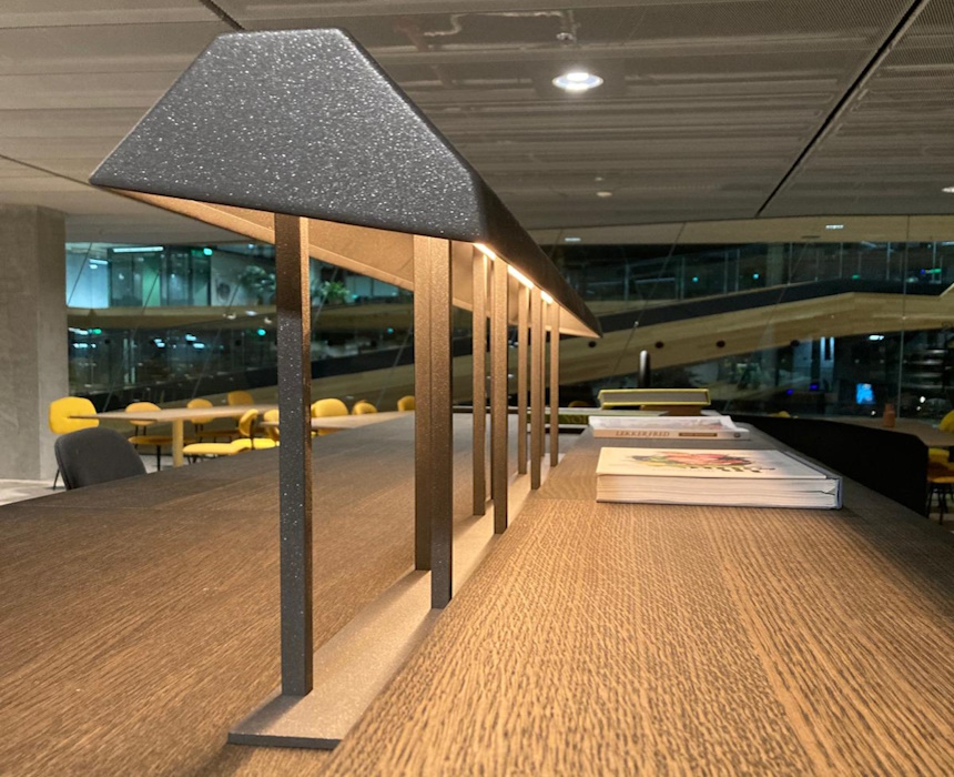Multiple sizes of table reading lamps with an asymmetrical shade equipped with Dali controllable LED lighting. The fixtures are fixed to the tabletop. Construction made of powder-coated steel plate and anodic effect coating.
