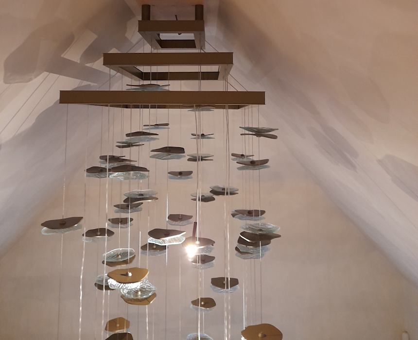 De elementen, 115 stuks, zijn een combinatie van een ‘bloemblaadje’ van blank niagara glas en een bronze anodic gepoedercoat deel.