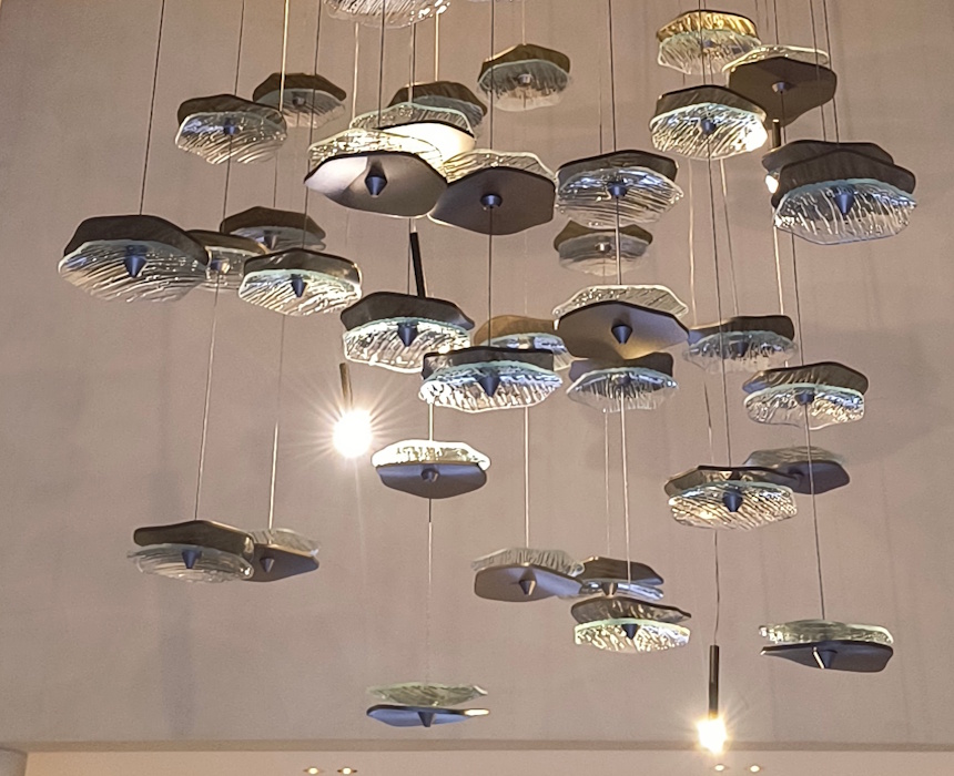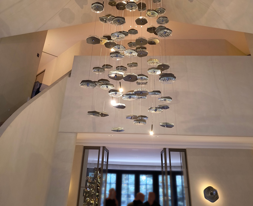 Chandelier, met een totaalhoogte van 3,5 meter, opgebouwd uit samengestelde elementen en miniscule lichtpuntjes.
