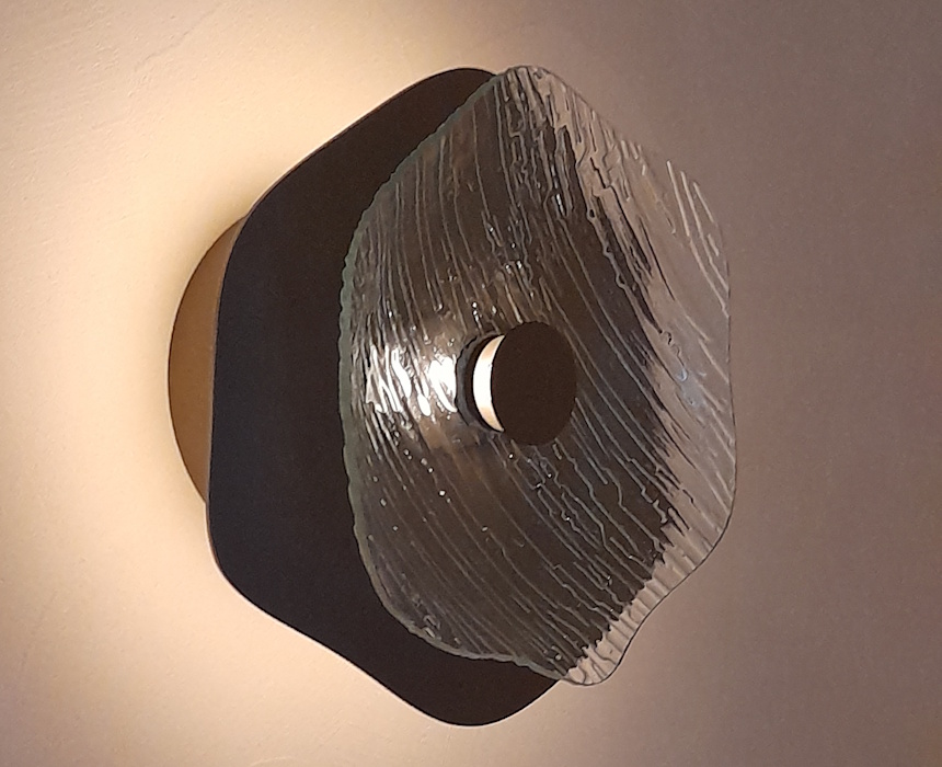Daarnaast zijn in dezelfde stijl 2 wandarmaturen gerealiseerd met een groot ‘bloemblad’ van niagara glas.