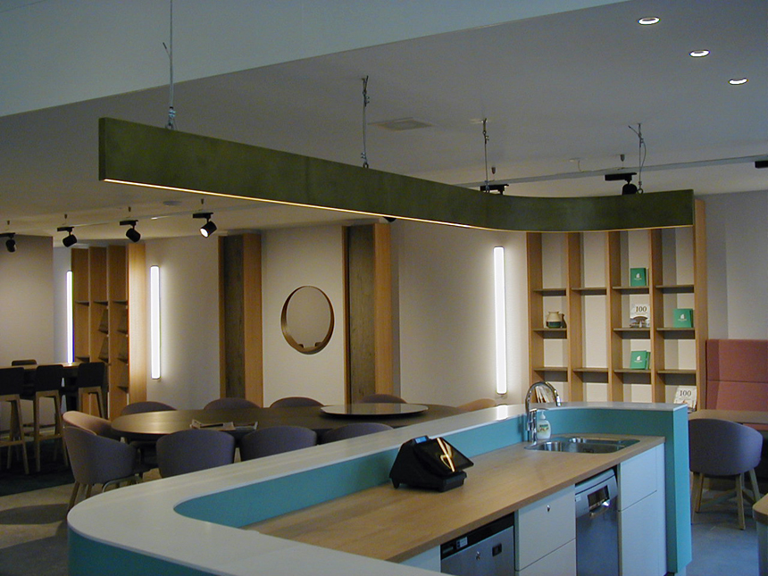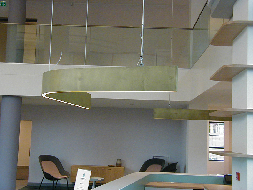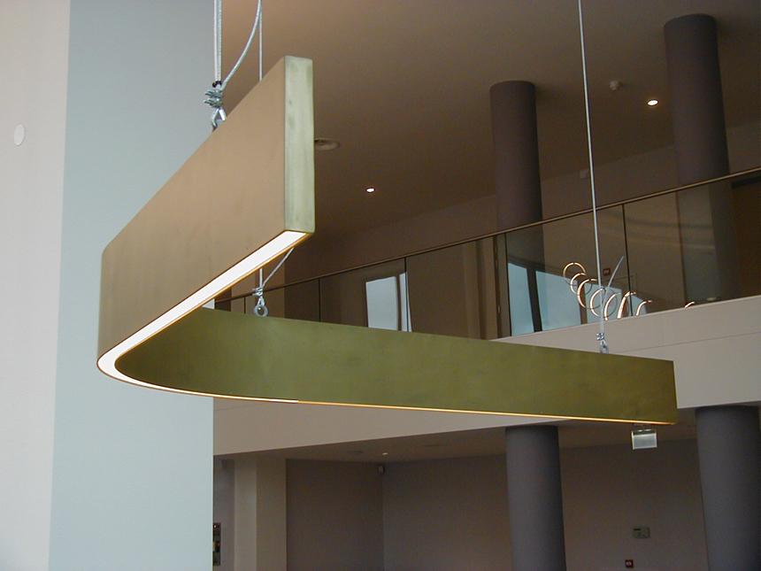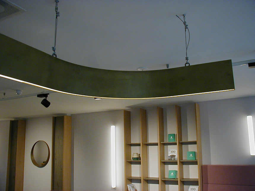 Twee dunne strips als additionele balieverlichting. De strips zijn opgebouwd uit twee evenwijdige stalen stroken met een dikte van 4 m/m.
