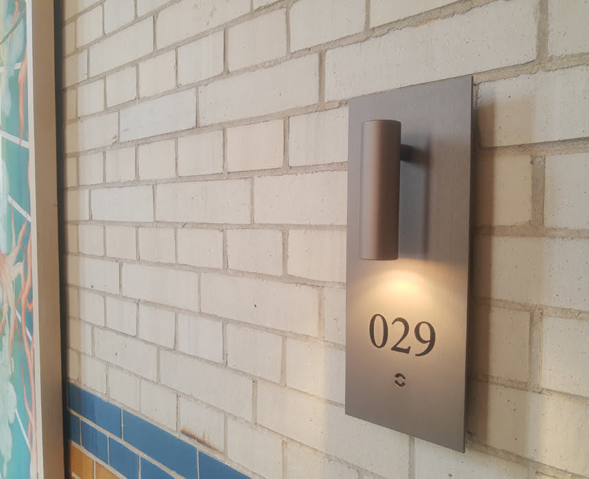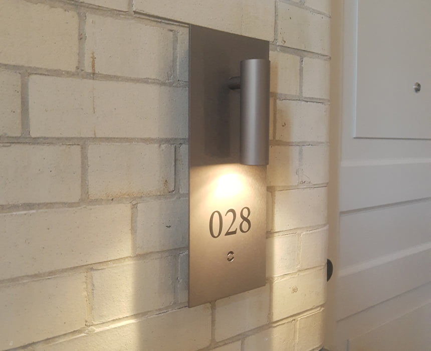 Hotelkamernummer met als basismateriaal geborsteld aluminium, geanodiseerd met verdiept liggende kamernummeraanduiding.