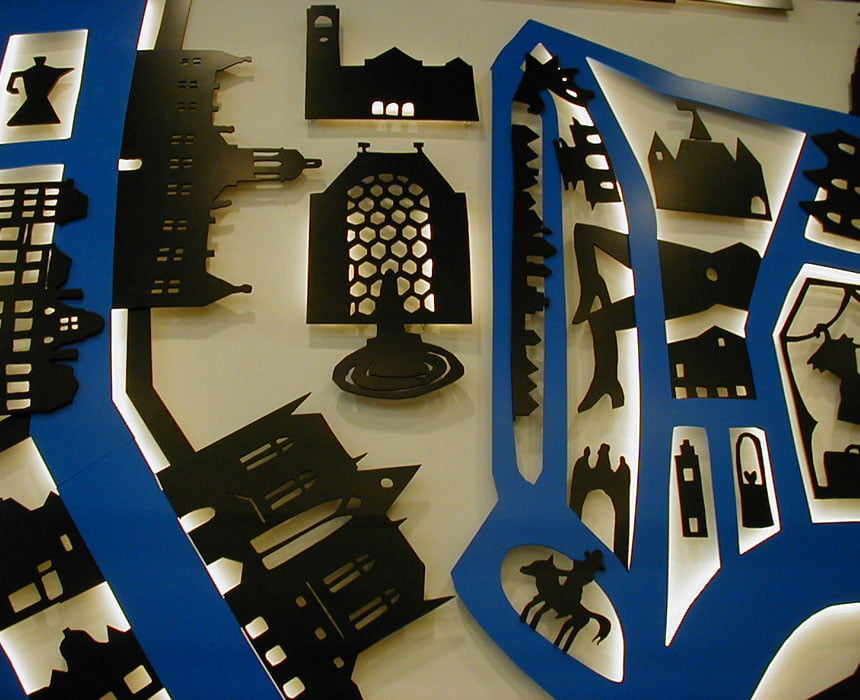 Het geheel is uitgevoerd in lasergesneden aluminium voorzien van demontabele muursteunen.