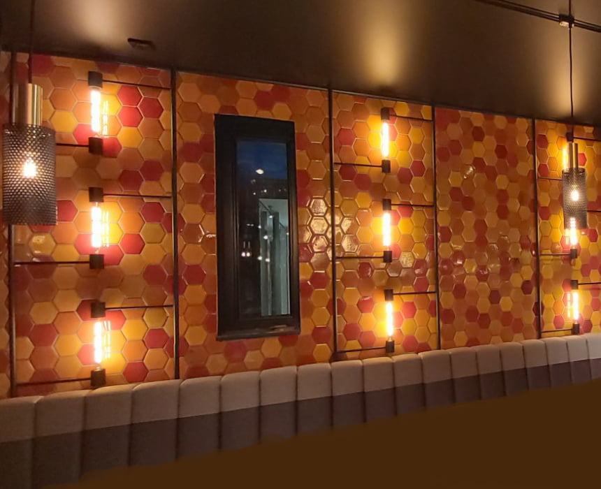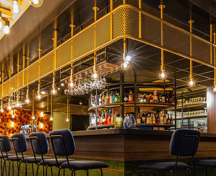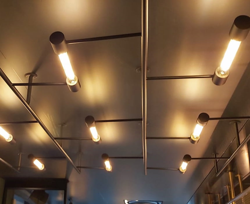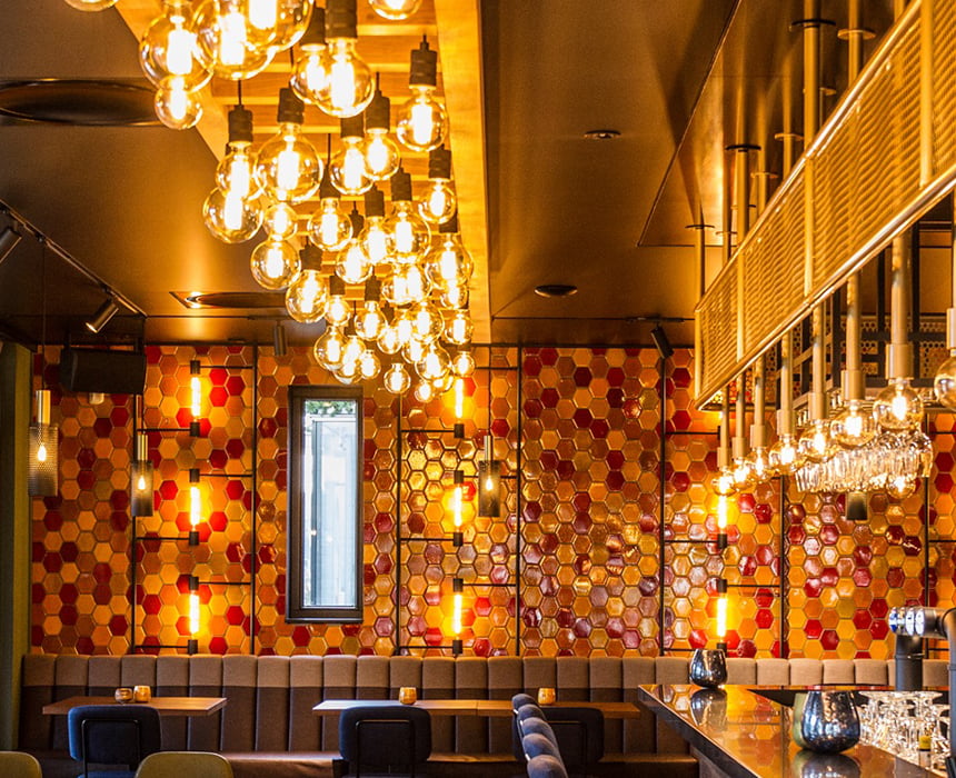 Sfeerverlichting voor een horecagelegenheid op basis van een amberkleurige LED buislamp en globe LED lampen.