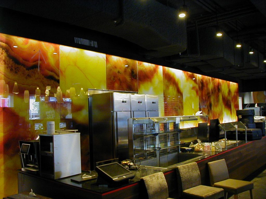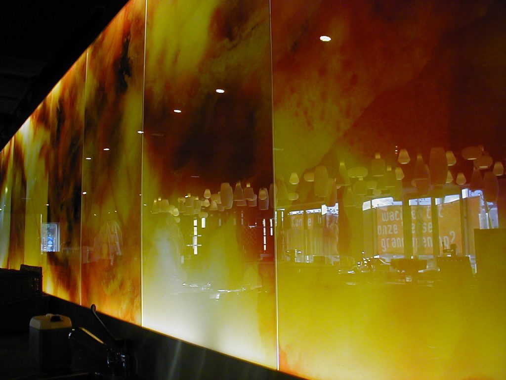 Deze beeldbepalende wand bestaat uit een grafisch bewerkt natuursteenmotief gelamineerd achter gehard glas.