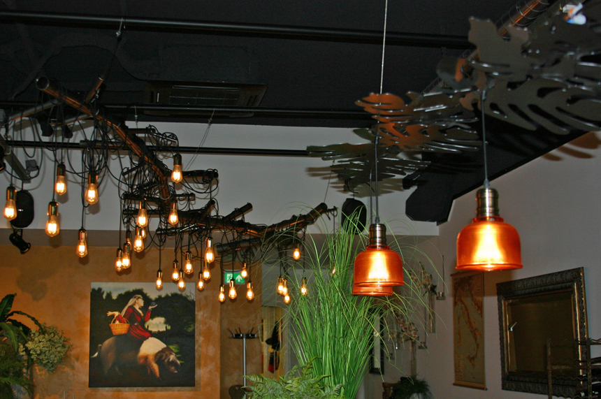 Achterin het restaurant is een grote boomstructuur met overdadige bedrading toegepast. De LED lichtbronnen zijn dimbaar voor een flexibele belichting.
