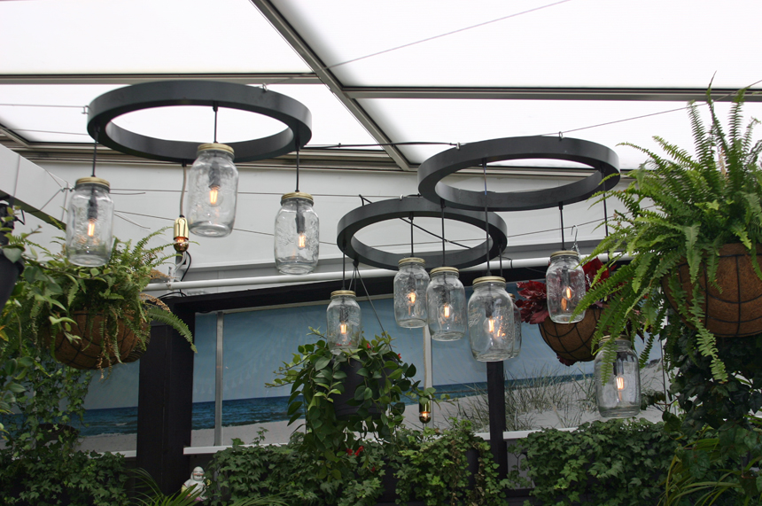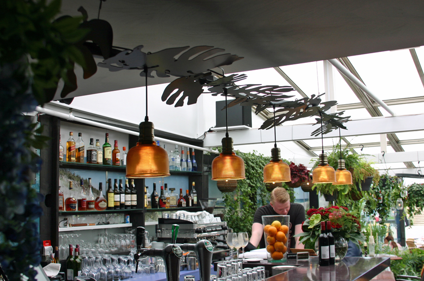 De barverlichting hangt vrij in de ruimte. Door toepassing van een opengewerkt bladmotief blijft het restaurant één ruimtelijk geheel.